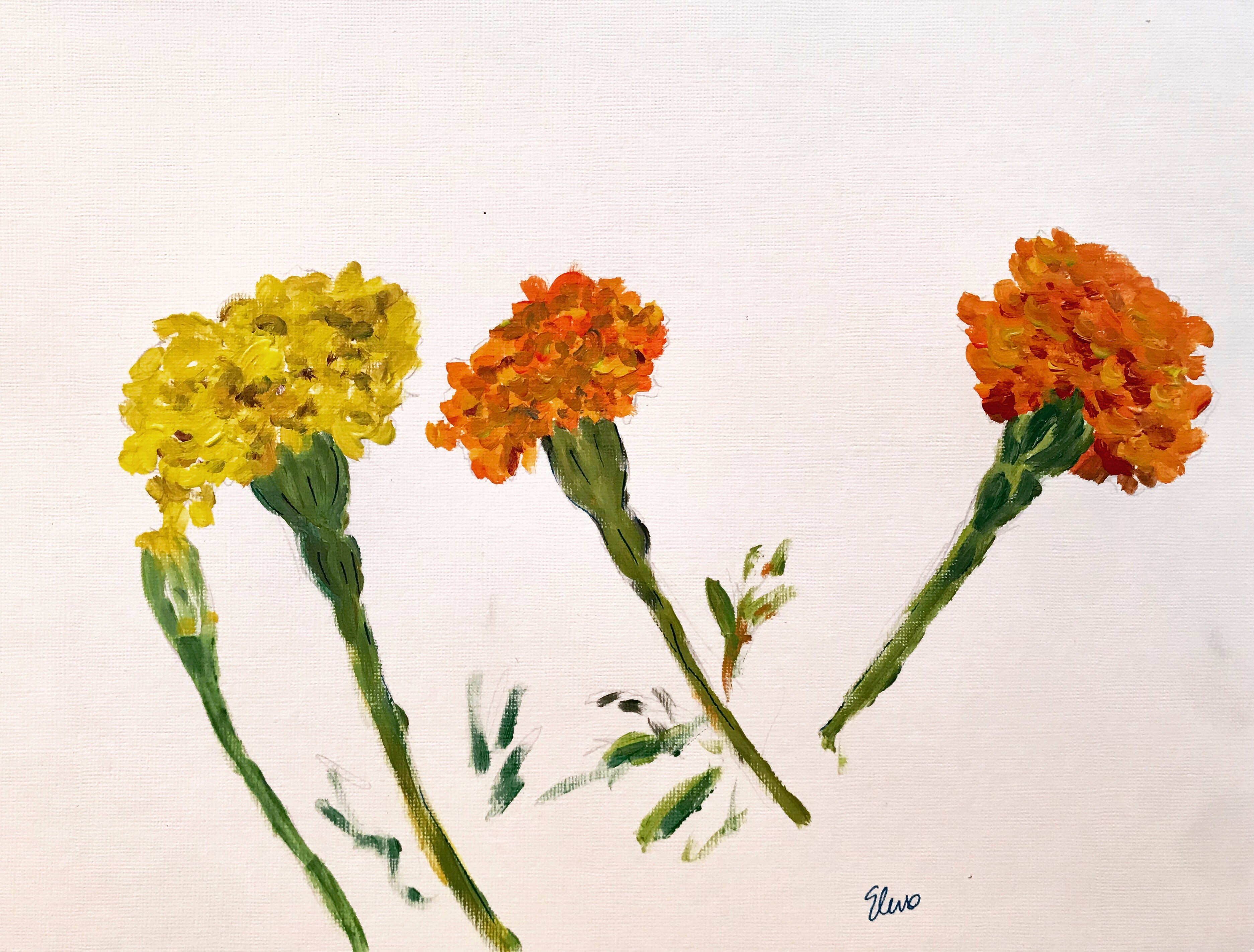 On my way home from the gym I stopped to buy cereal, and happened upon fresh marigolds in the flower section. I just love marigolds and am obsessed with the beauty, mystery, and good intentions behind the Dia de los Muertos altars that pop up around town this time of year. I arranged my marigolds on the table in the gallery, and with all the small framed watercolors around, it does look a bit like an ofrenda in honor of Betty and Edna. I like that.