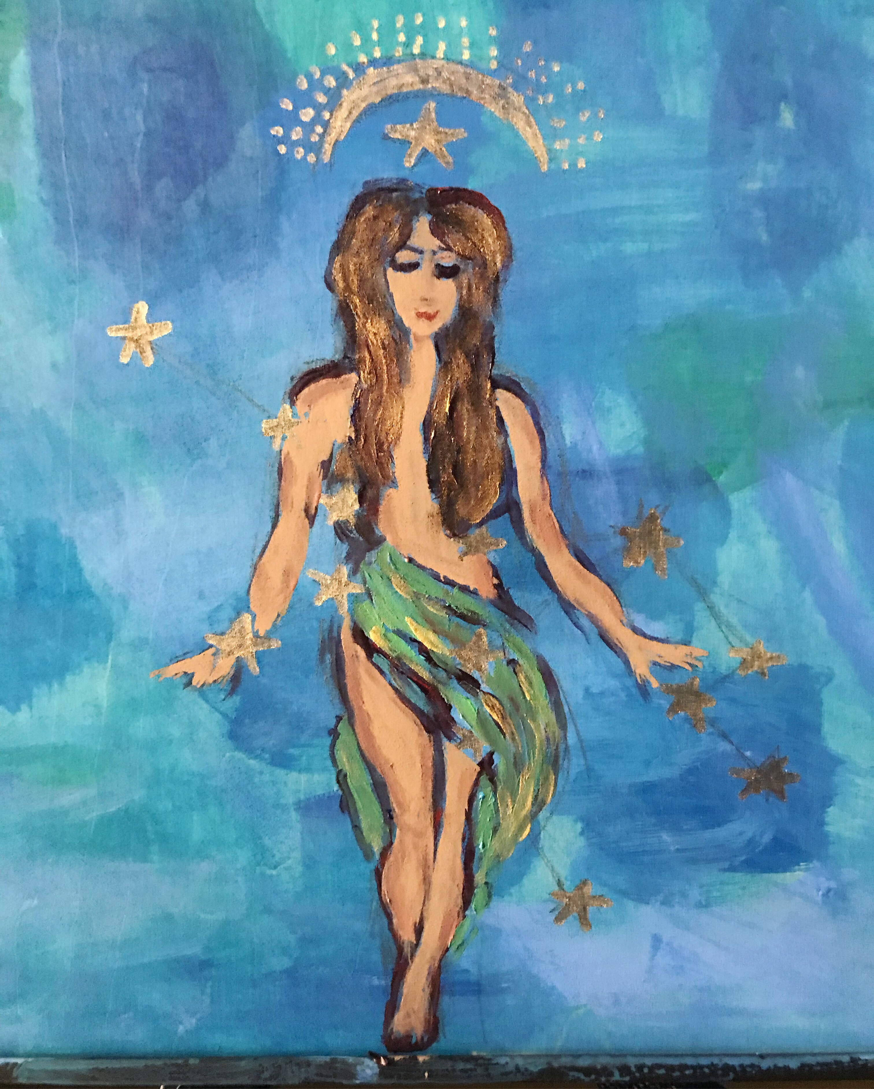 Today I added beautiful Virgo to my Astrology painting. I love Virgos. They tend to be drama-free and have a beautiful way of seeing things. My very old grandmother is a Virgo, and I’ve always absolutely adored her. When I was little I loved the way she talked about things. I was enchanted in her presence and would simply do what she told me because the way she presented it struck me as lovely. The old lizard, on the other hand, had to use more forceful methods to get me to do her bidding, but my grandma was always gentle and patient and I found myself wanting to please her.