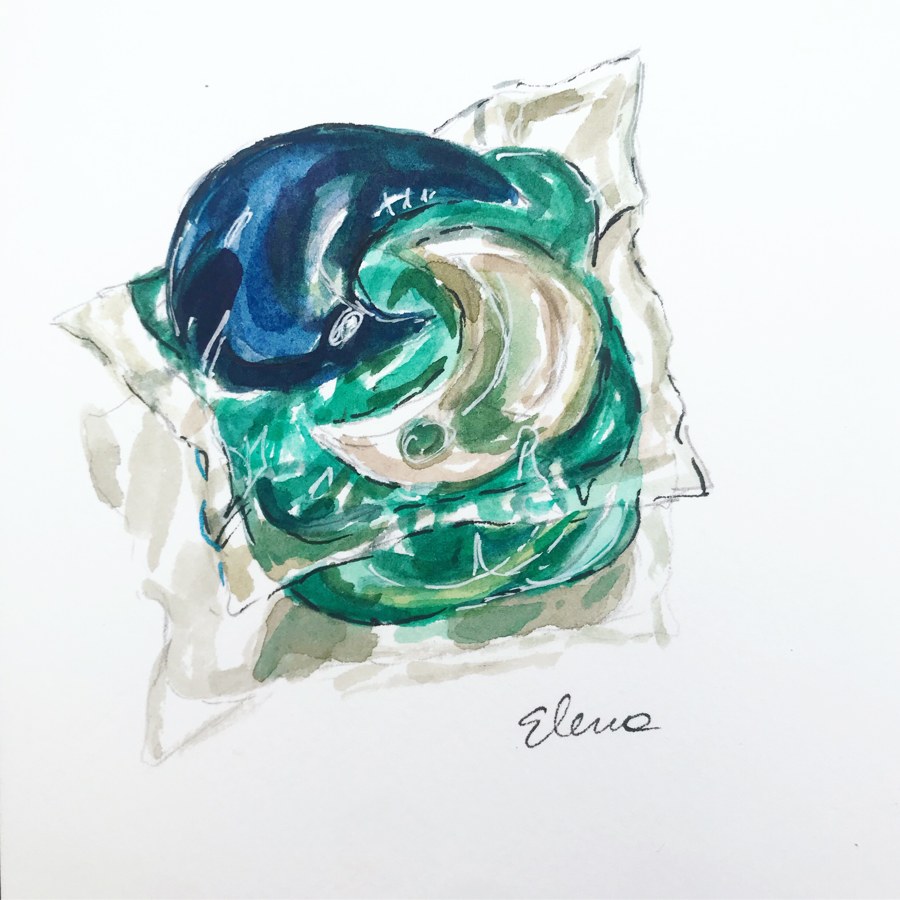 Much to John’s chagrin, who was hoping I’d paint Nancy swimming, I decided to paint a Tide pod today. Ok, I’ll admit it, I was out of ideas. It was very hot out, and I took a nap in the middle of the day. I was hoping I might dream up something to paint, but I didn’t. Anyway, the Tide pod turned out well. It looks shiny and liquid, and my conversation with John while I was painting it was funny.