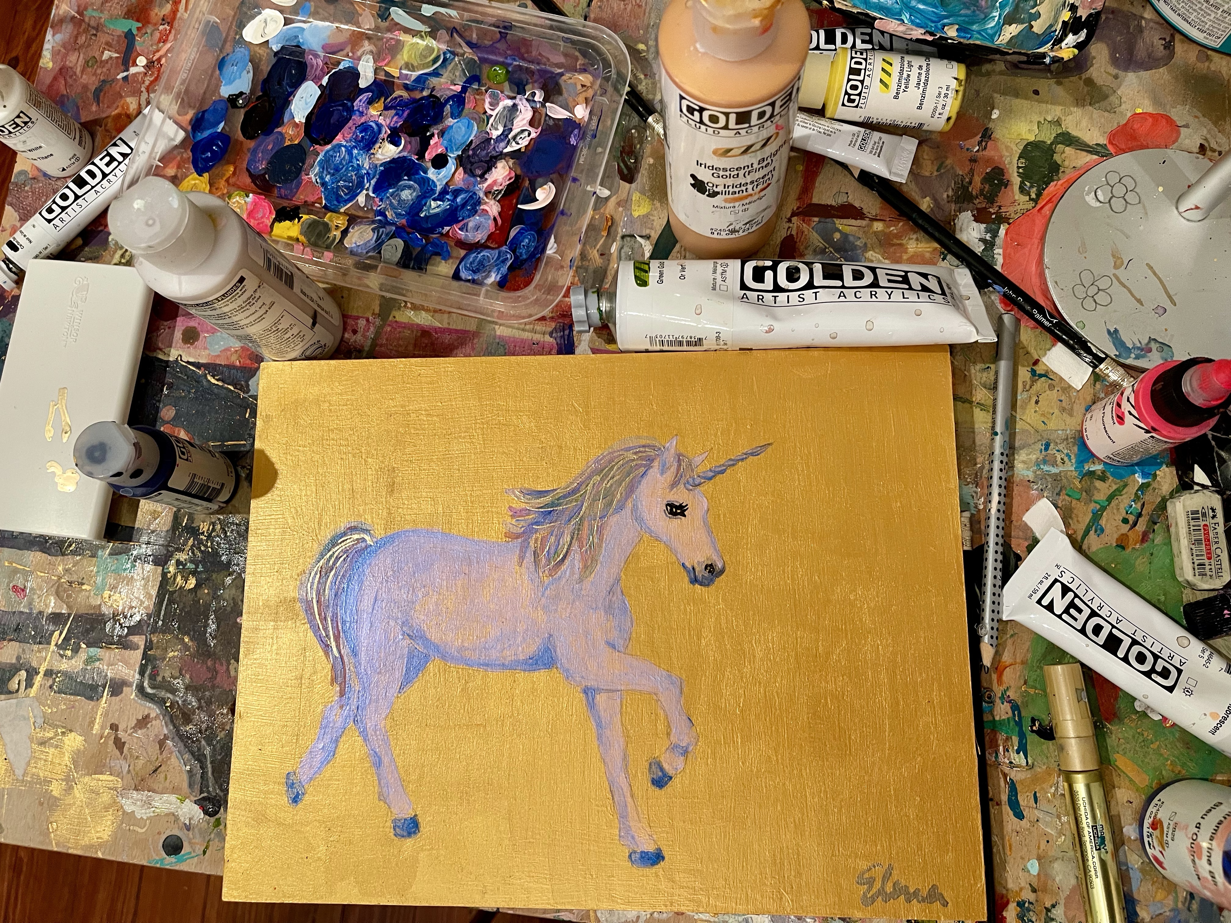 A few days ago I got this idea for a unicorn on a gold background that uses interference blue and is ethereal and does fun light effects. I’m glad I decided to paint it. Might do more.
