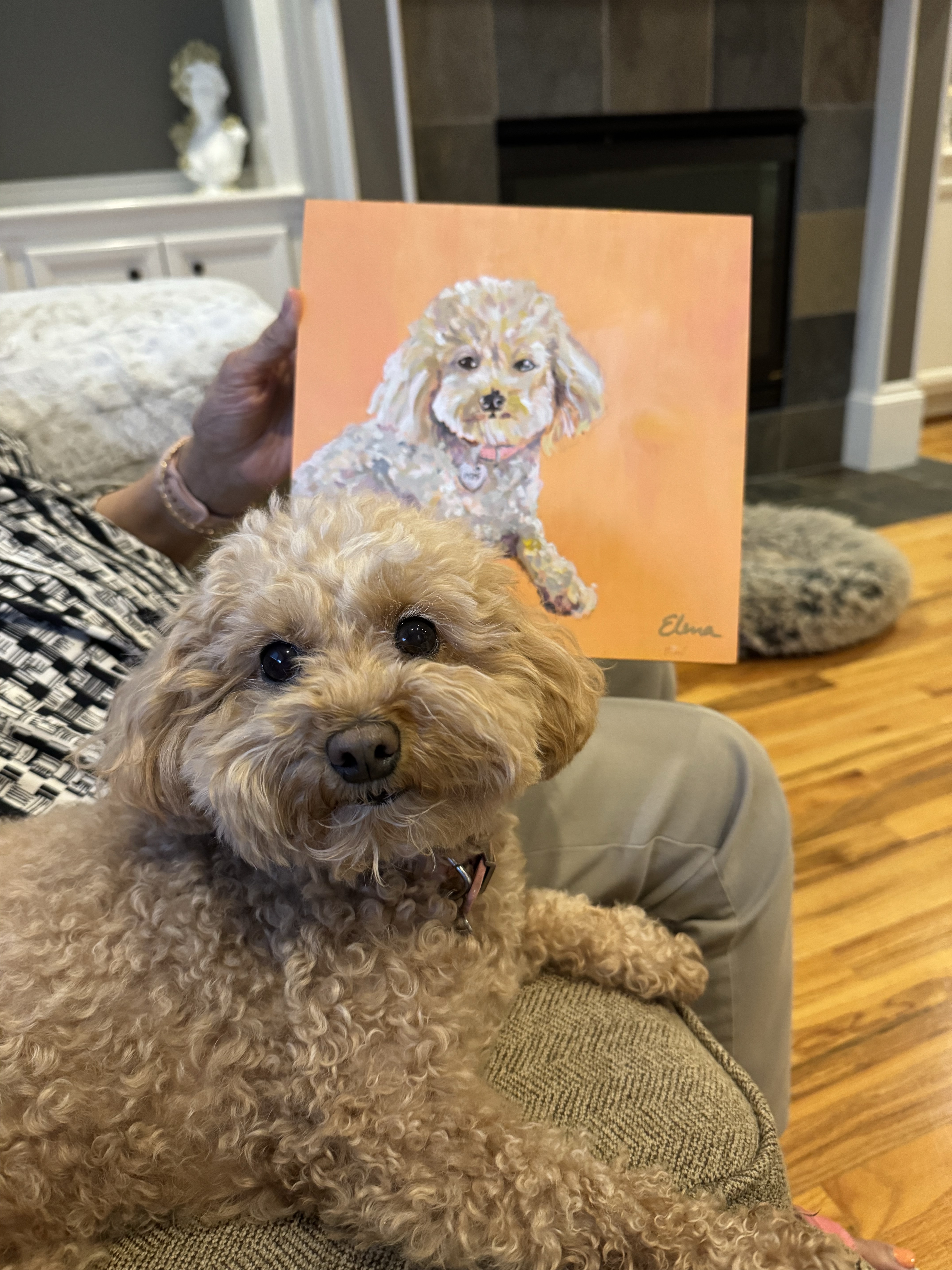 I don’t always share pictures of my dog portraits because they often tend to be gifts and I obviously don’t want to spoil the surprise! Such was the case with the portrait of Mimi, the beautiful dog in the picture. I painted it about a month ago. And I really really loved how it turned out!