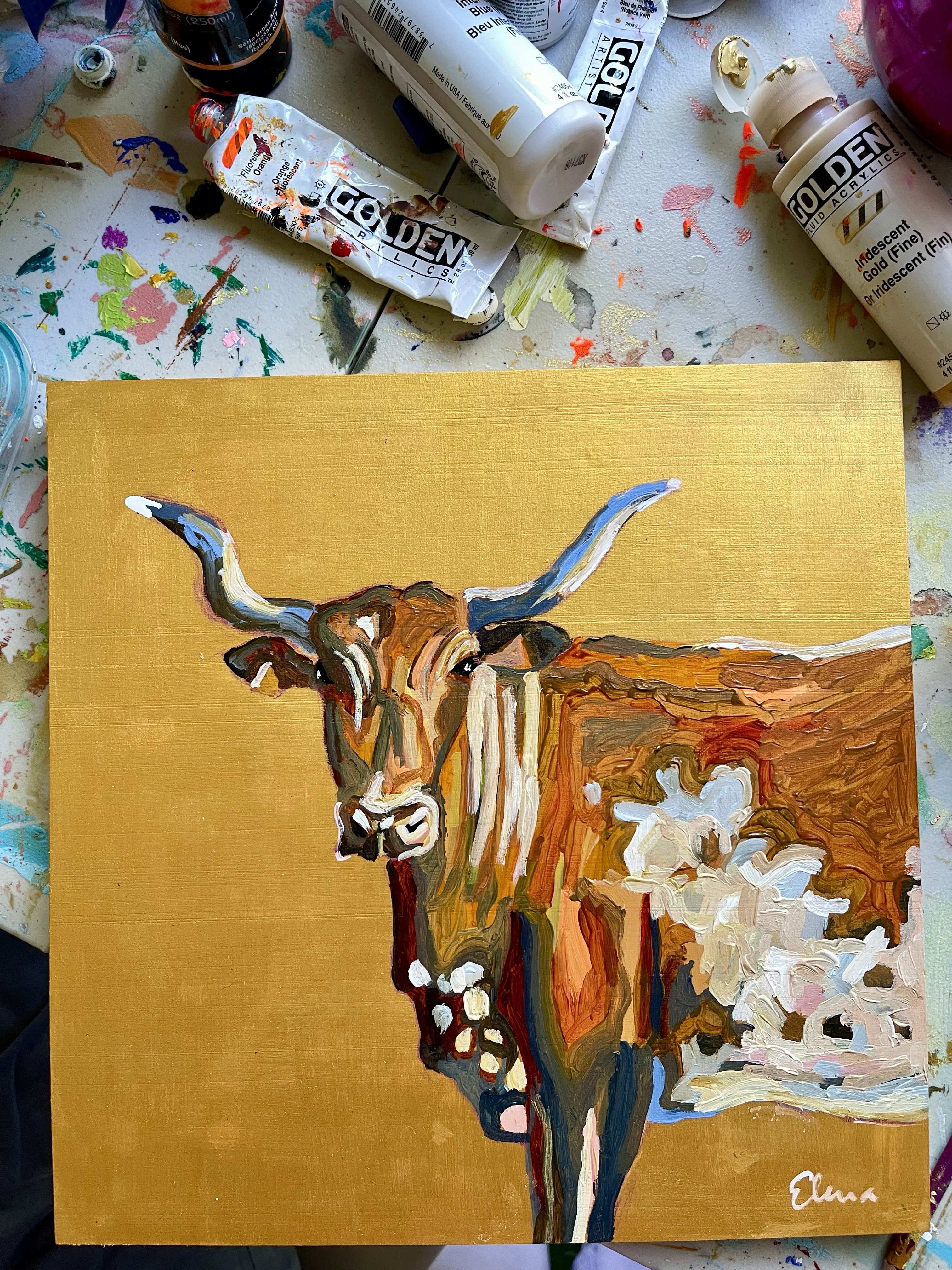 This morning I painted this longhorn. Then later I drove to Houston. There was a little happy hour at Fidelity in the Heights, the title company where I’m currently showing art. It ended up being a lovely evening, full of surprises. Friends who live out of town and whom I hadn’t seen in a long time showed up. I met some new people too. And yes, I sold this longhorn.