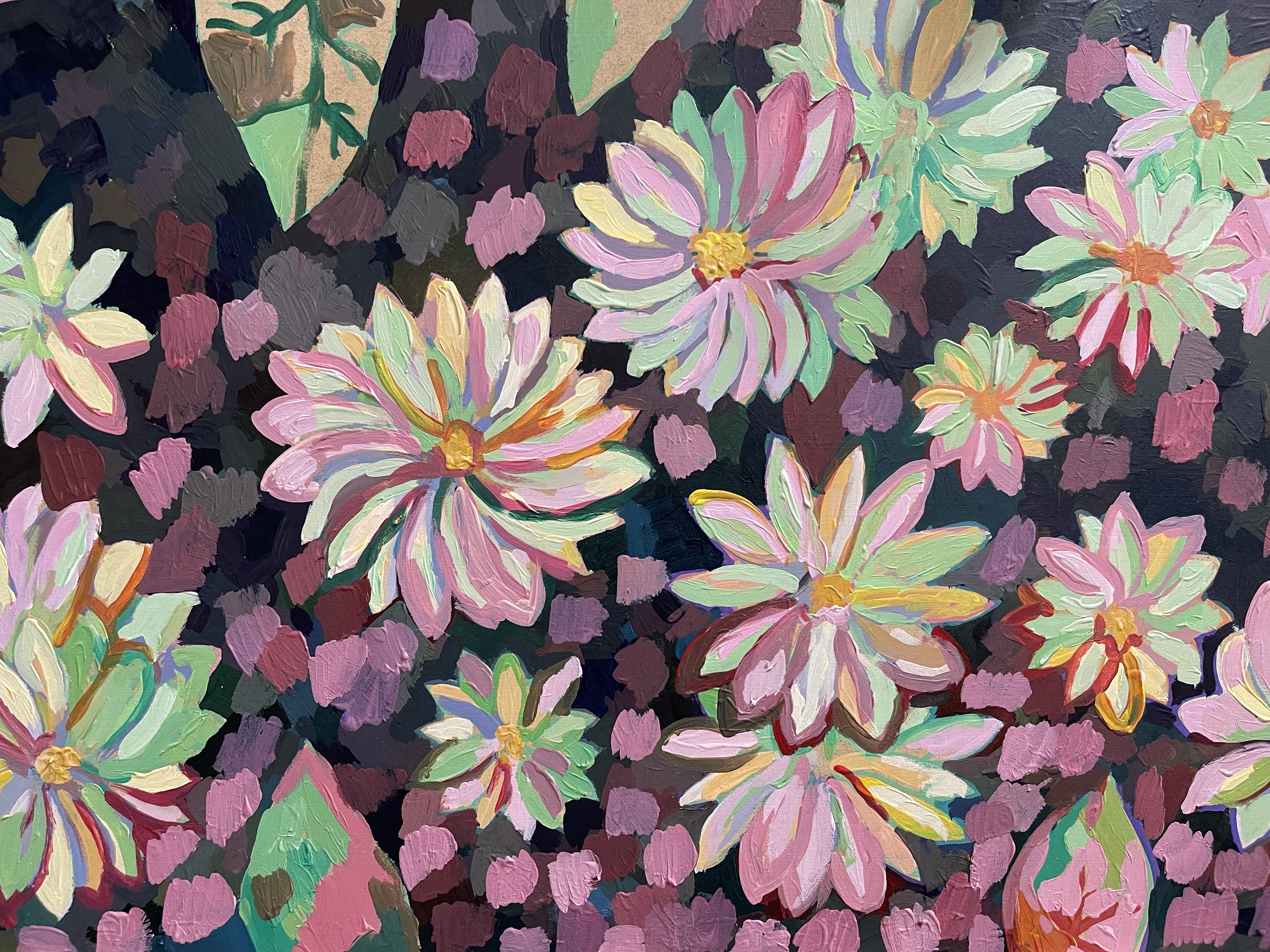 Tonight I felt the need to paint something relatively mindless. I’m not good at making stuff up. I need images for reference, but I allowed myself to just run with this flower theme.